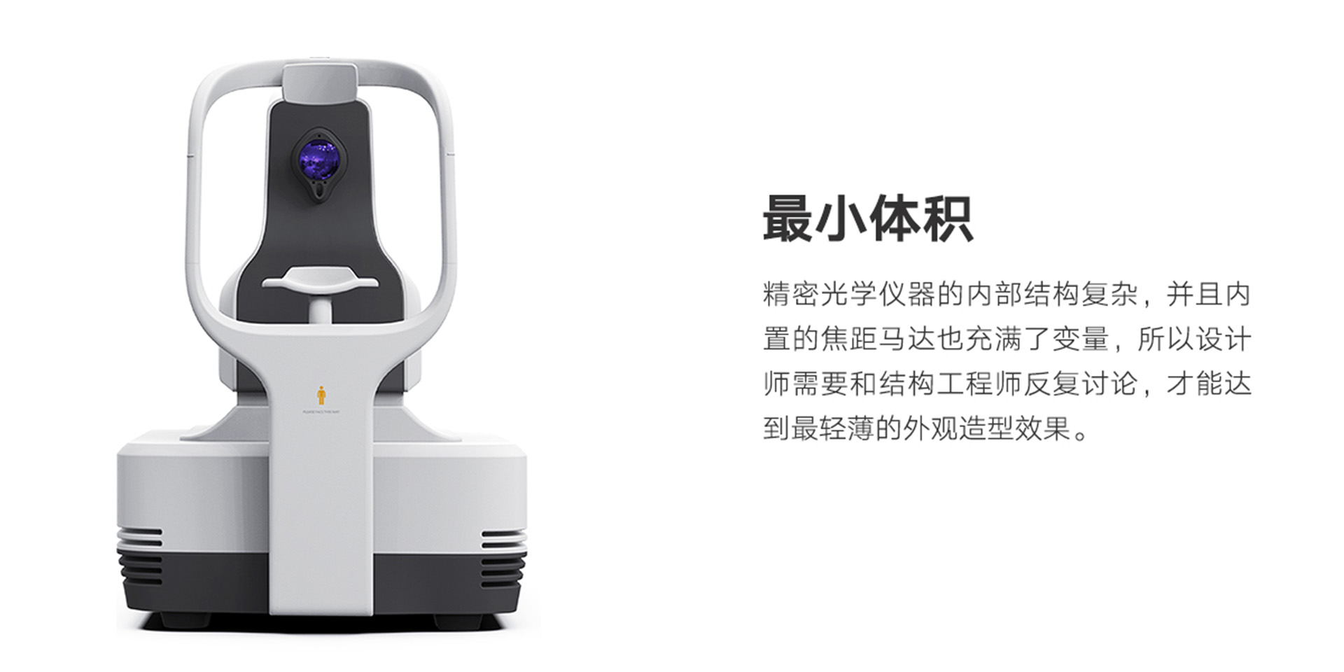 視微光學(xué)相干斷層掃描儀率先采用模塊化設(shè)計(jì)思路,將整機(jī)分類成多個(gè)核心組合部件,形成多功能的整合與搭配。在分析了整個(gè)醫(yī)療行業(yè)的發(fā)展趨勢(shì)之后,最終以數(shù)碼化的設(shè)計(jì)思路,打造一款在行業(yè)內(nèi)更加年輕化,更加具有前瞻性的戰(zhàn)略性產(chǎn)品。完整的大曲面包裹住主機(jī)的所有結(jié)構(gòu)件,深灰與白色的分色,整機(jī)充滿未來與科技感,賦予產(chǎn)品引領(lǐng)行業(yè)的使命;嵌入式臉托,隱藏式摳手等細(xì)節(jié)的設(shè)計(jì),盡量保證產(chǎn)品設(shè)計(jì)元素的統(tǒng)一性,增強(qiáng)一體性。手柄處黃色標(biāo)識(shí)圈作為品牌識(shí)別點(diǎn)將應(yīng)用到系列產(chǎn)品中,形成視微品牌自己的品牌形象特點(diǎn)。在外觀和功能引導(dǎo)上,去除多余的干擾因素,目的是讓用戶更好地體驗(yàn)使用過程和使用環(huán)境或?qū)W⒂谇胺降娜蝿?wù),順利完成檢查的工作。