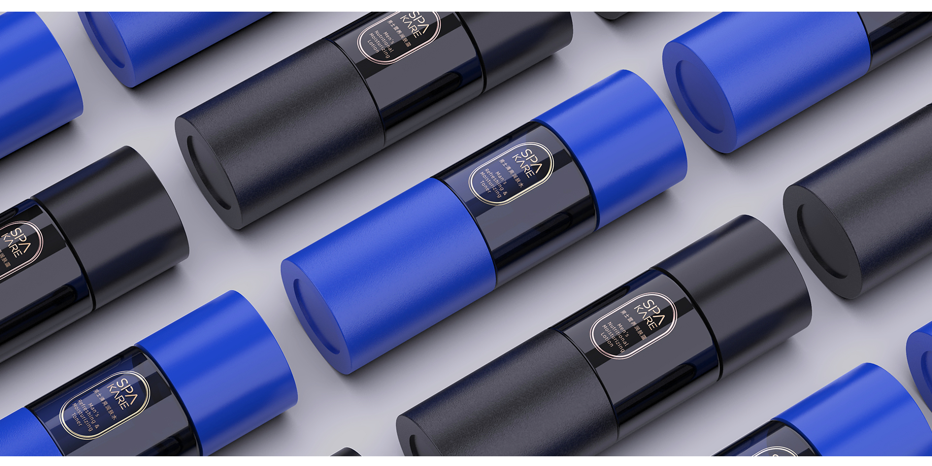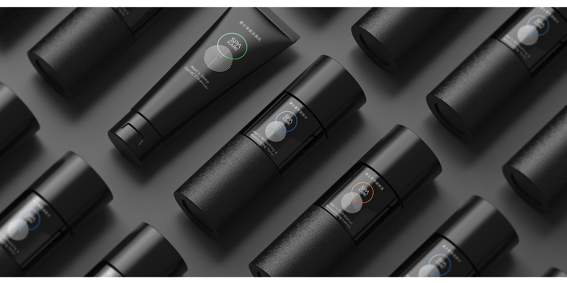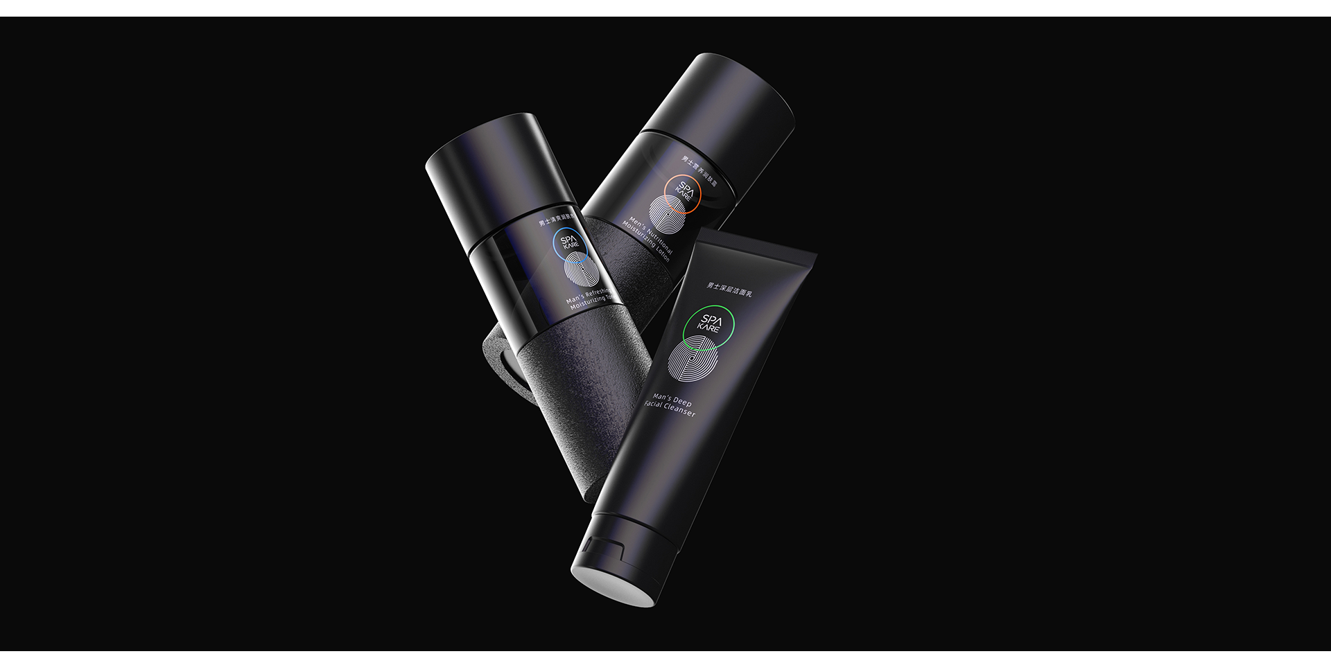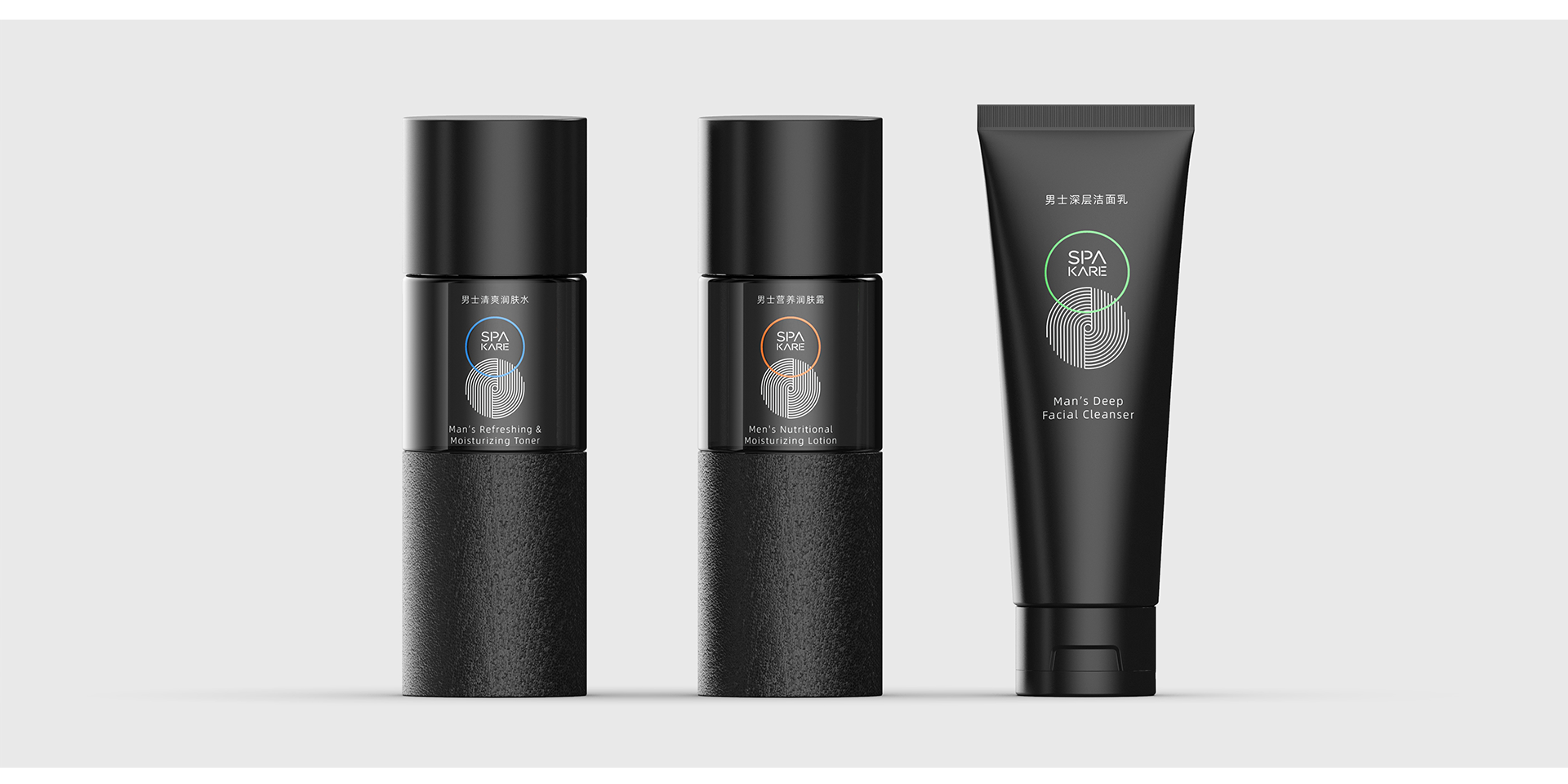 產(chǎn)品透體采用墨黑色,凸顯男士與產(chǎn)品的冷硬氣質(zhì),不同的材質(zhì)肌理豐富產(chǎn)品包裝層次。通過醒目的產(chǎn)品信息,及鮮亮的彩色色環(huán),強化產(chǎn)品信息及產(chǎn)品功能。