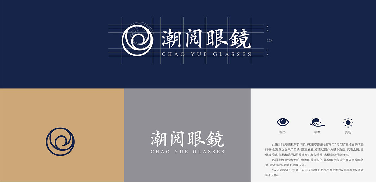 本次品牌設(shè)計靈感來源于“潮”,將潮閱眼鏡的縮寫“C”與“浪”相結(jié)合構(gòu)成品牌徽標(biāo),標(biāo)志以圓作為基本形態(tài),代表太陽,象征著希望、生機(jī)和光明,同時標(biāo)志也形似眼睛。色彩上選擇代表光明、雅致的香檳金色,沉穩(wěn)的亮咖棕色來突出視覺效果,營造簡約、高端的品牌形象。