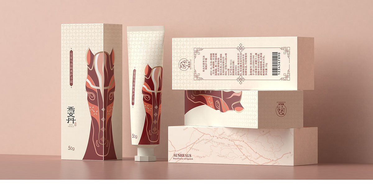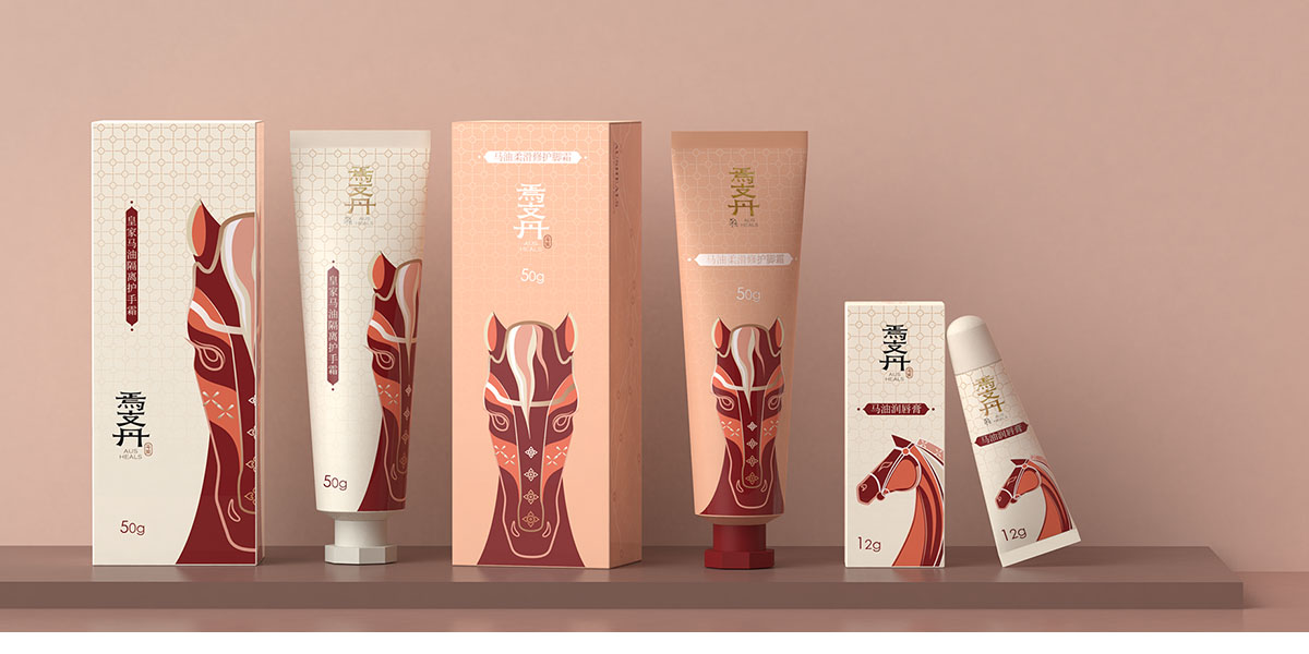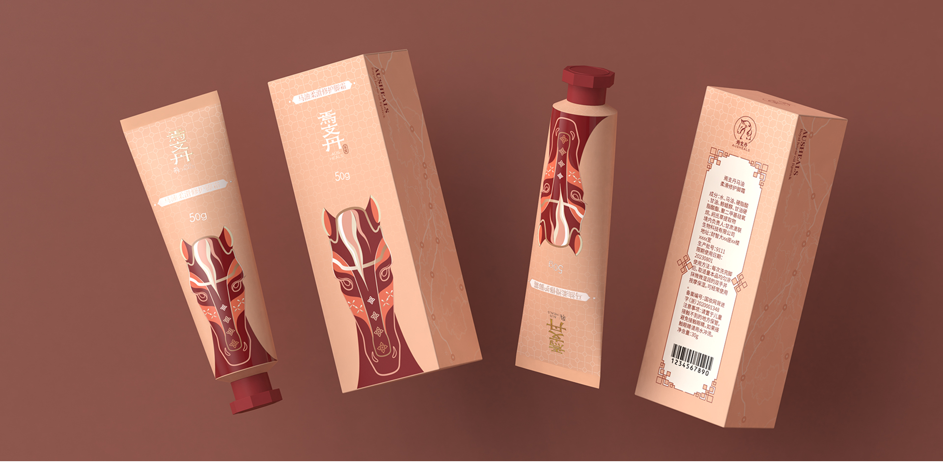 本方案中抓住產(chǎn)品主打成分“馬油”的視覺載體“馬”,將西北地理特征與歷史圖紋融入馬頭設(shè)計(jì)中,豐富產(chǎn)品內(nèi)涵。在系列產(chǎn)品色彩上中針對產(chǎn)品特性運(yùn)用了冰川藍(lán)與沙丘棕來對應(yīng)噴霧與馬油產(chǎn)品,體現(xiàn)噴霧補(bǔ)水舒緩與馬油產(chǎn)品滋潤保濕的特點(diǎn),打造西北視覺品牌。