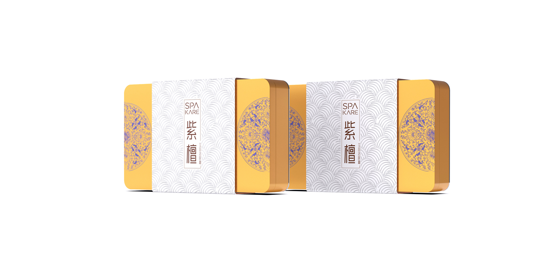 盒體布局靈感來源古代龍袍兩肩處圓形紋樣,圓形象征圓滿完美。盒體與盒體相接兩側(cè)紫檀花紋樣會組成完滿的圓形。紫金配色透露著品牌低調(diào)與奢華,白銀的傳統(tǒng)水紋腰封強化品牌調(diào)性。
