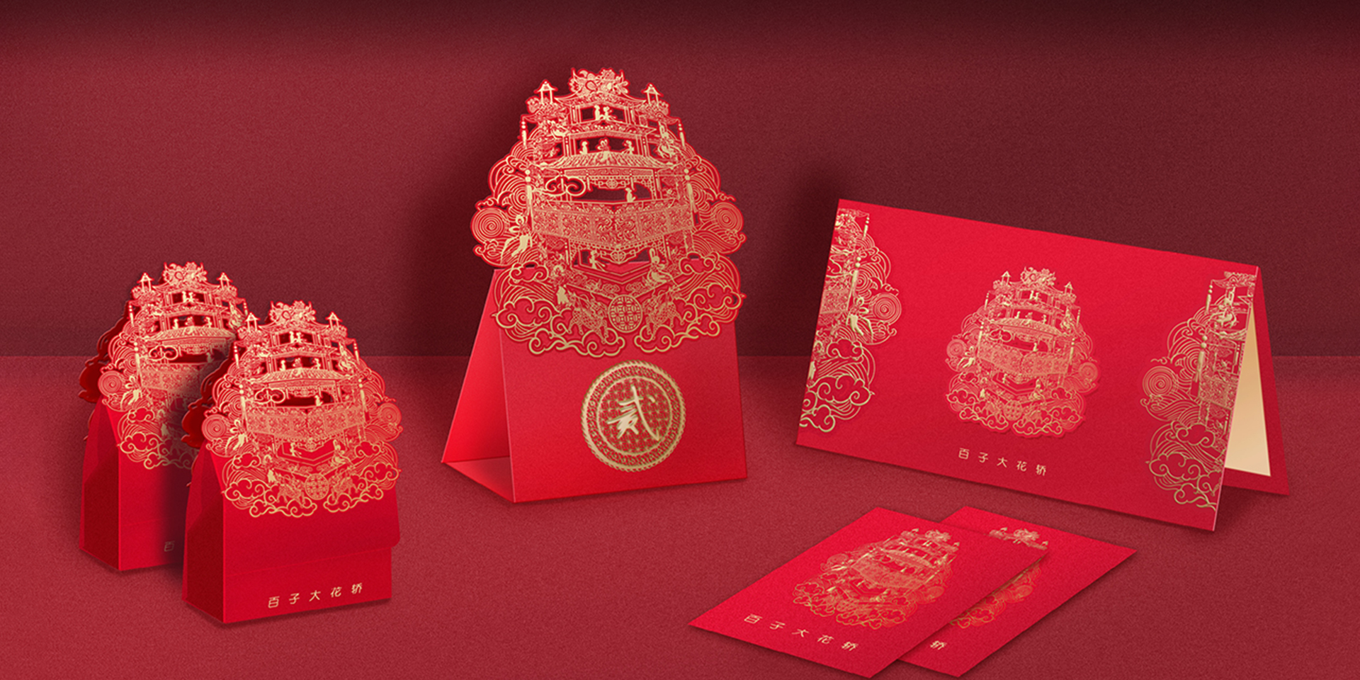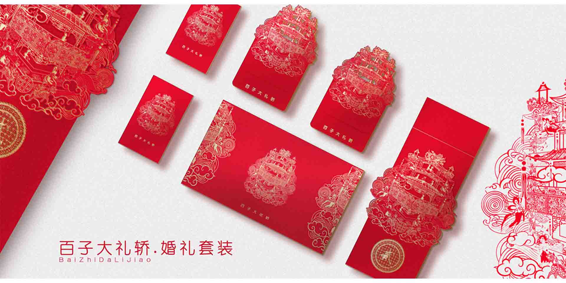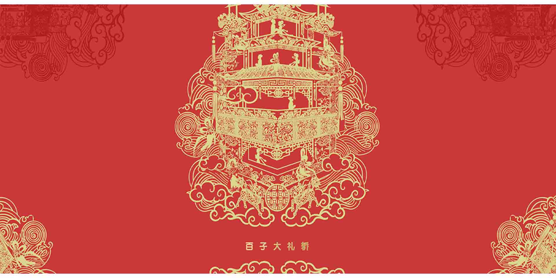 上海市歷史博物館館藏民國百子大禮轎是制作于上世紀(jì)三十年代的甬式大花轎,集多種非物質(zhì)文化遺產(chǎn)技藝于一身,工藝精湛,美輪美奐;同時(shí)它又是上海移民文化、民俗文化與海派文化融合的重要表征,實(shí)為館藏精品重器。當(dāng)木馬設(shè)計(jì)有幸看到花轎真顏的那一刻,便對(duì)它肅然起敬,更激發(fā)了為花轎做好喜事衍生品的愿望,將它的美融入人們的喜事生活。花轎有"軟衣式"和"硬衣式"兩種。"軟衣式"是在轎框的四周罩以紅色的綾羅帷幕,硬衣式指花轎的全身都是木制結(jié)構(gòu),造型類似四方四角出檐的寶塔頂形。甬式花轎屬于該類型。該花轎制作采用圓雕、浮雕、貼金、涂銀、朱漆等裝飾手法,呈現(xiàn)數(shù)百個(gè)人物和花鳥蟲獸等吉祥圖案,配上彩繪的鏡片水銀玻璃和艷麗的金銀彩繡轎衣,朱金相間,光彩奪目,美輪美奐。