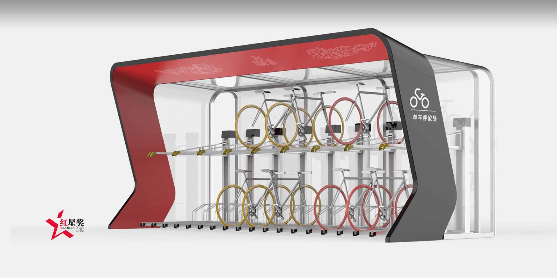 雙層立體自行車庫是成都市政府與中國(guó)**的鋼結(jié)構(gòu)公司中建鋼構(gòu)合作規(guī)劃并委托木馬設(shè)計(jì)的一款產(chǎn)品,木馬通過對(duì)成都市的文化背景研究,提出了川劇臉譜的概念,得到了成都市政府的高度認(rèn)同。產(chǎn)品抽象化川劇臉譜裝扮的帽檐,以及帽檐兩側(cè)的緞帶,再將其重新結(jié)合為車庫的外形,并輔以傳統(tǒng)的二龍戲珠圖騰,增加其文化寓意。將城市傳統(tǒng)文化與現(xiàn)代化生活聯(lián)系,增強(qiáng)了城市現(xiàn)代化進(jìn)程中年輕用戶群體的文化認(rèn)同,同時(shí)也成為城市展示自己的一個(gè)有力的文化符號(hào)。