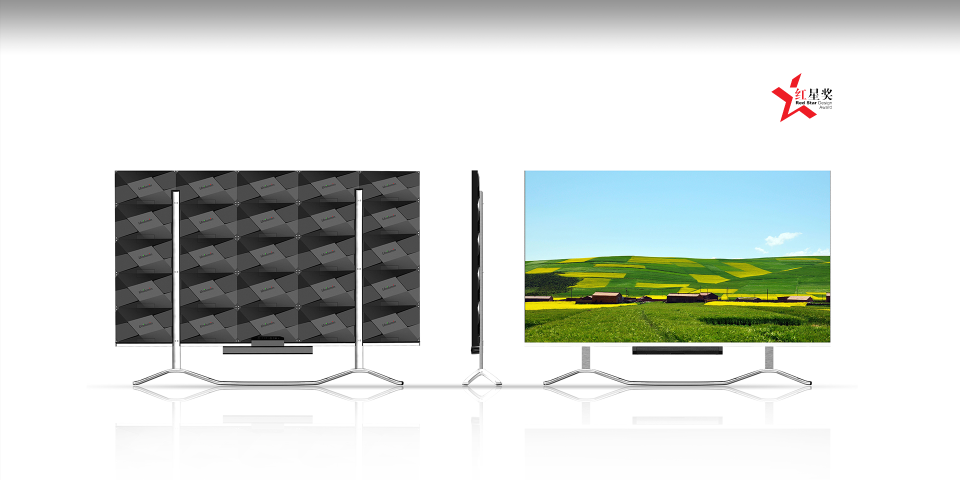 為洲明科技設(shè)計(jì)的小間距LED電視,將一望無際的大海與柔軟細(xì)膩的沙灘產(chǎn)生的微妙海浪運(yùn)用到產(chǎn)品的設(shè)計(jì)。設(shè)計(jì)中抓住這個(gè)舒適悠閑的場(chǎng)景與產(chǎn)品相結(jié)合。小間距LED電視是由多個(gè)小屏拼接的大屏幕,與滴水匯聚成大海的意向一致,水滴之間匯聚融為一體它們的融合是圓潤(rùn)無痕的,這與產(chǎn)品小間距拼接的訴求相貼合。海面上的平靜沉著,海底卻暗流洶涌、豐富多彩,與小間距LED電視光滑完整的屏幕和內(nèi)在卓越的性能相吻合。在設(shè)計(jì)中不斷探索產(chǎn)品與靈感點(diǎn)的內(nèi)在契合從而對(duì)產(chǎn)品設(shè)計(jì)不斷打磨。在為洲明科技設(shè)計(jì)的小間距LED電視,從方案早期的產(chǎn)品定義到設(shè)計(jì)的完成一直與客戶保持良好溝通,設(shè)計(jì)得到了客戶的高度認(rèn)可。