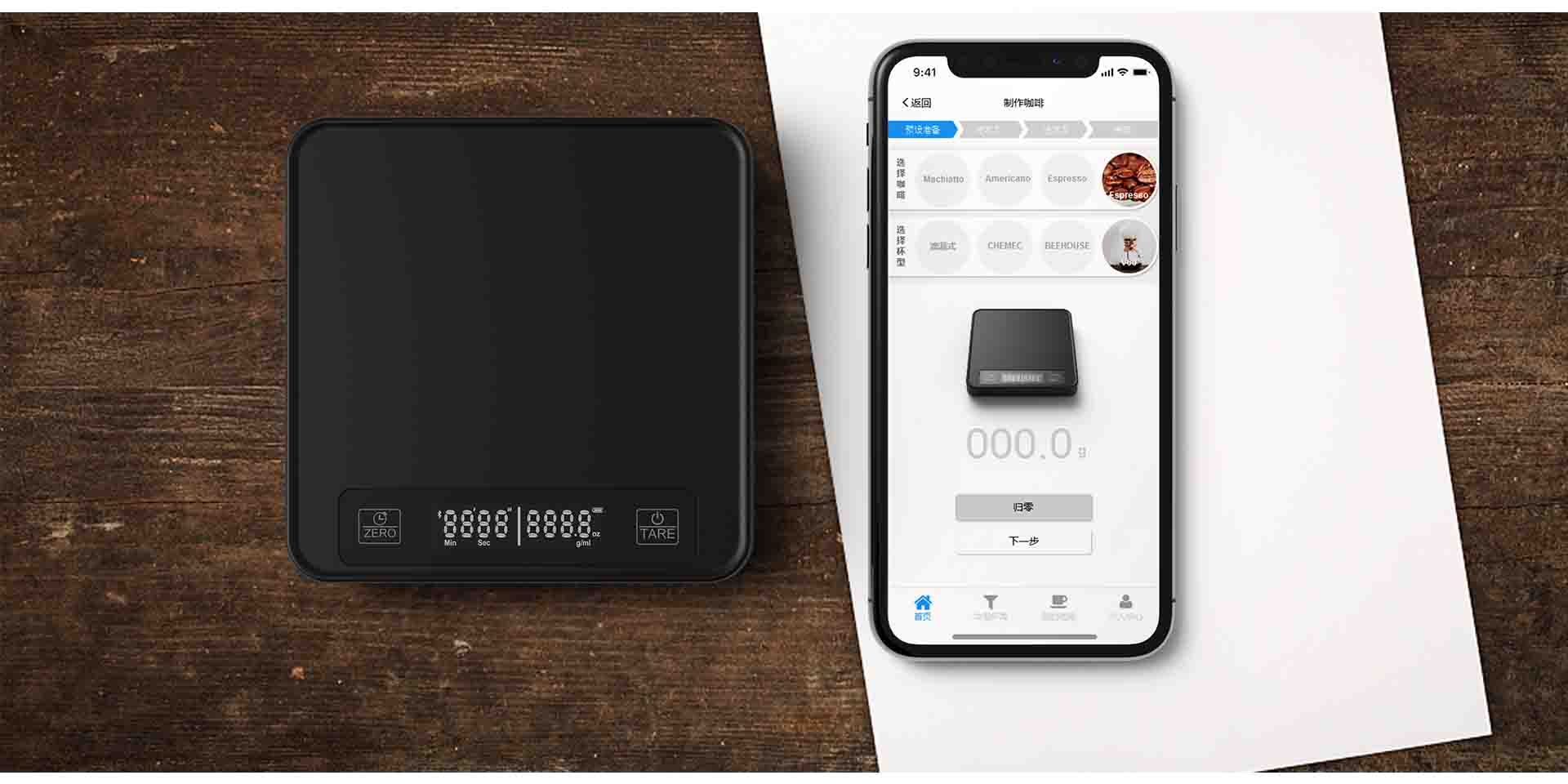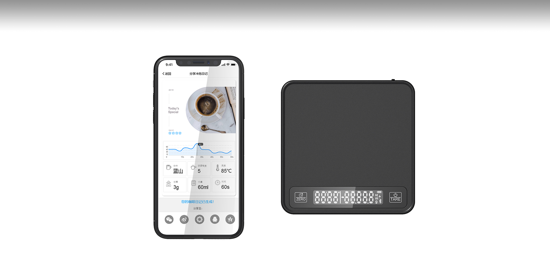 該產(chǎn)品通過藍(lán)牙連接手機(jī)App,由手機(jī)觀察記錄咖啡沖泡情況,掌控時(shí)間或是記錄你喜愛的咖啡水豆比例的智能咖啡秤,并且可以通過App生成配方圖片一鍵分享至社交軟件,與朋友分享交流手沖咖啡的樂趣。外型設(shè)計(jì)有著簡(jiǎn)約的現(xiàn)代感,一體成型,細(xì)節(jié)精致,與手沖咖啡的烹調(diào)場(chǎng)景相融合,十分專業(yè)利落。顯示時(shí)間與克重分區(qū),一目了然。