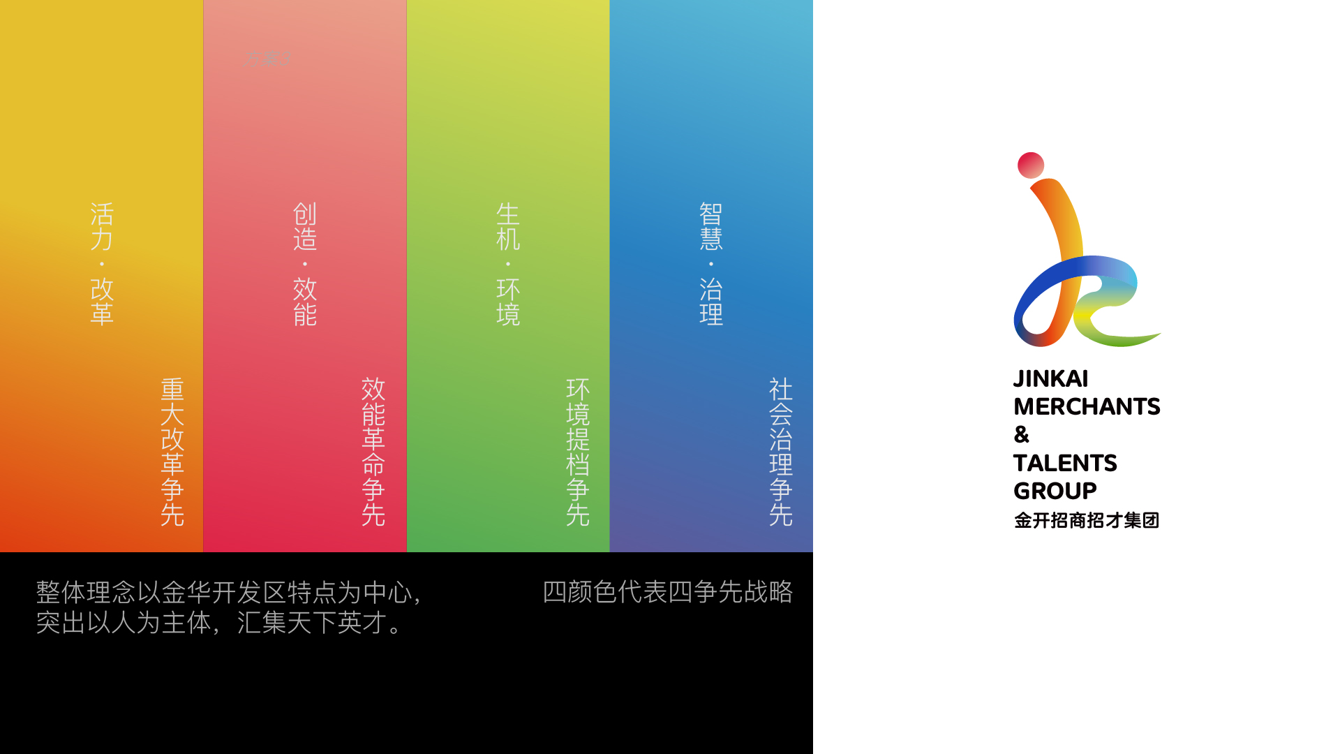 標(biāo)志整體以黃色、紅色、綠色、藍(lán)色為基調(diào),體現(xiàn)出金開科技、效率、永恒,具有旺盛的生命力,整體理念以金華開發(fā)區(qū)特點(diǎn)為中心,突出以人為主體,匯集天下英才。