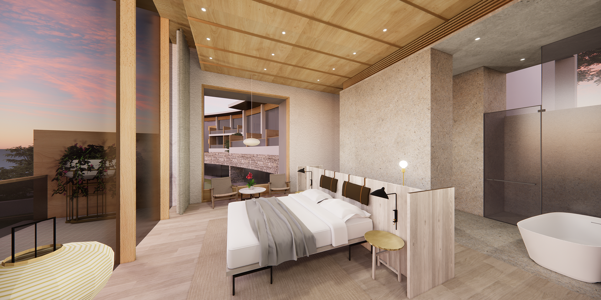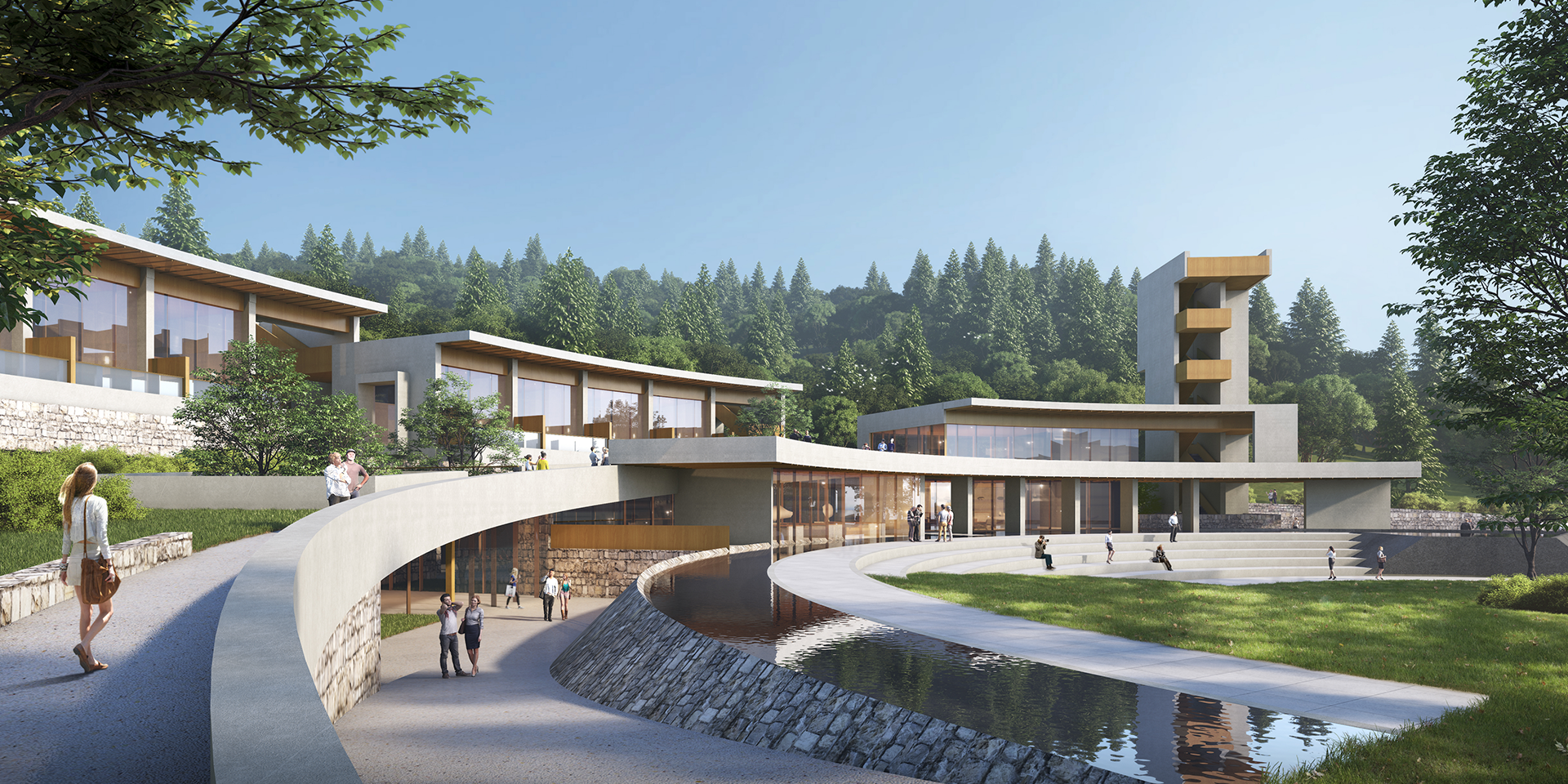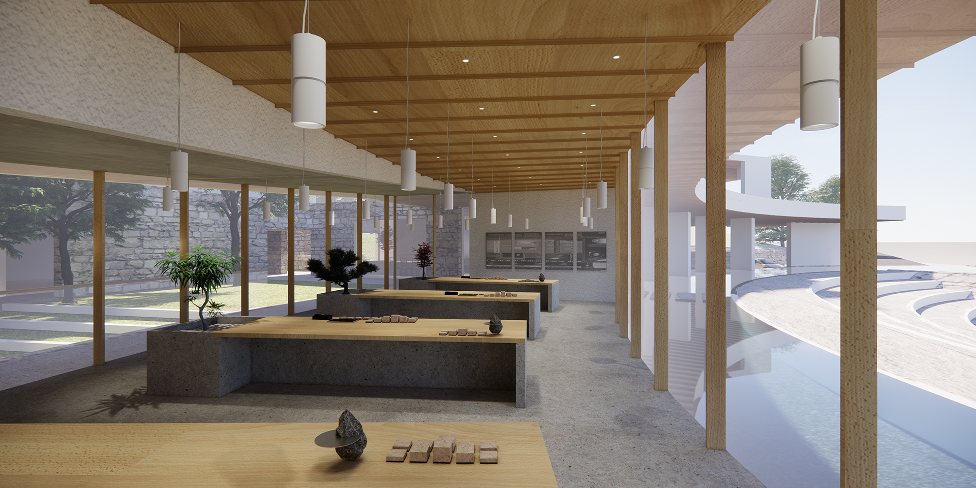 小東山村位于蒼山縣東南部,隸屬于山東省臨沂市蘭陵縣蒼山街道,本村的盆栽藝術文化歷史悠久,具有濃郁的地方風格和文化內(nèi)涵,為中國園林市場注入新的美學元素和文化內(nèi)涵,為本地的盆景產(chǎn)業(yè)發(fā)展提供了強大的支撐和動力。盆景藝術鄉(xiāng)創(chuàng)共同體建筑量體的構(gòu)成回應了場地的特性,結(jié)合面向湖岸的景觀優(yōu)勢,將六大主題空間有機分布排列與地形地勢結(jié)合,形成一個總體錯落,層層疊疊面向湖面展開的弧形建筑體。
