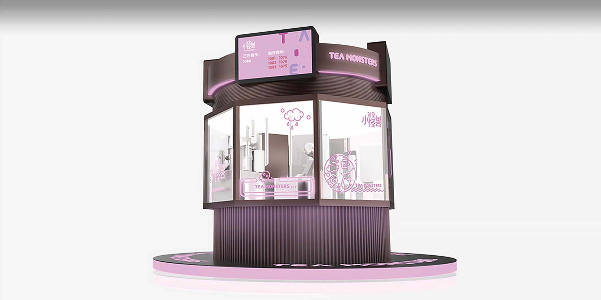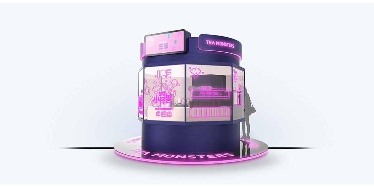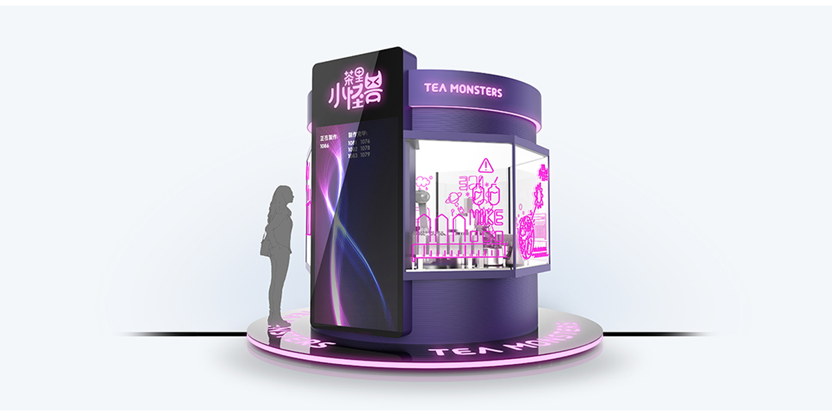 “茶里小怪獸”以為年輕人提供 24 小時全天候優(yōu)質(zhì)奶茶的夢想為出發(fā)點(diǎn),打造一款自助奶茶站。 基于靈活機(jī)械臂,采用環(huán)繞式玻璃窗口設(shè)計(jì),顧客可以 360°觀看一杯優(yōu)質(zhì)奶茶從煮茶、制冰到煮珍珠、加奶的一系列制作過程。窗口以小怪獸為主題,搭配炫彩霓虹,以全封閉的奶茶制作環(huán)境,給用戶帶來全新的使用體驗(yàn)。