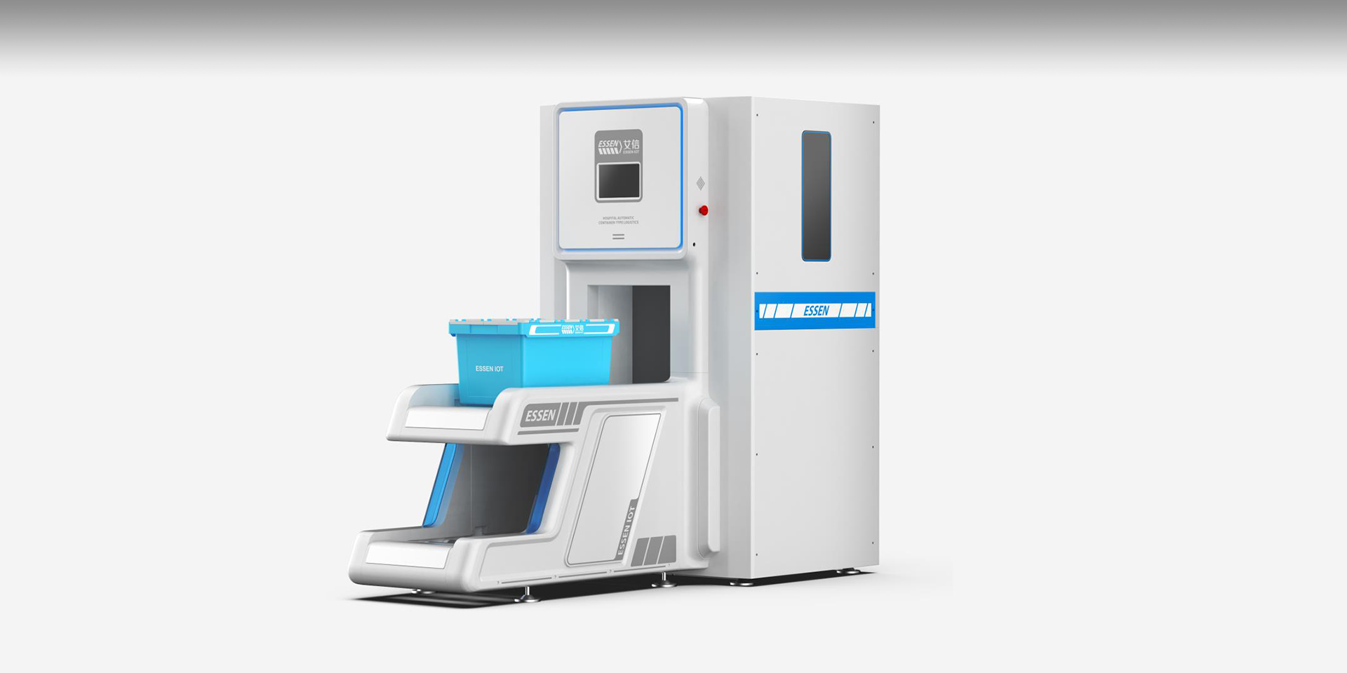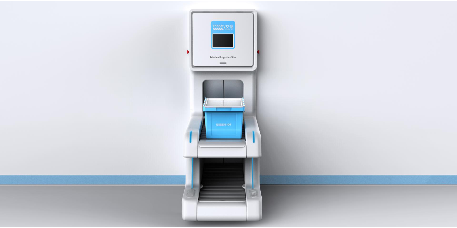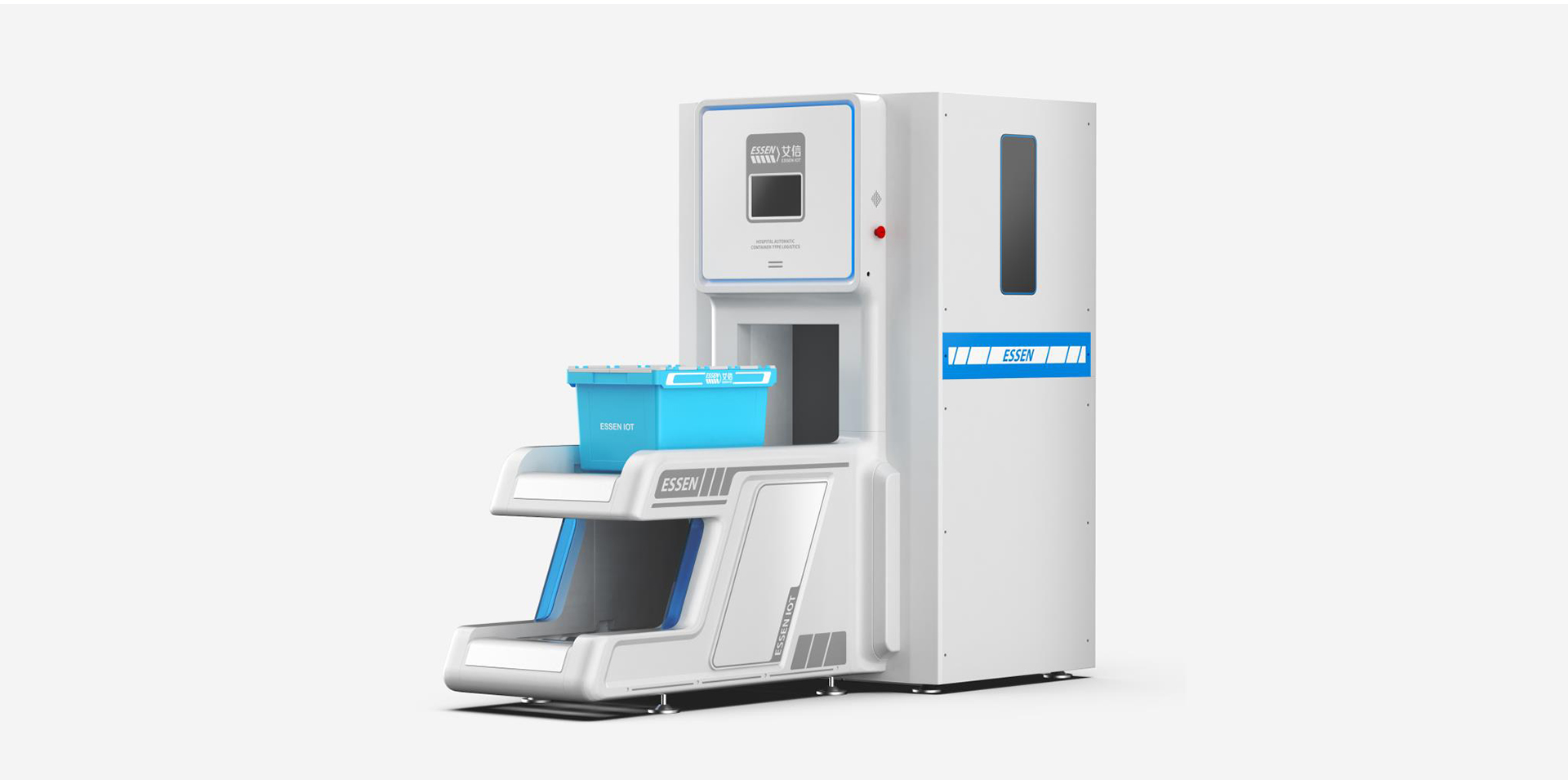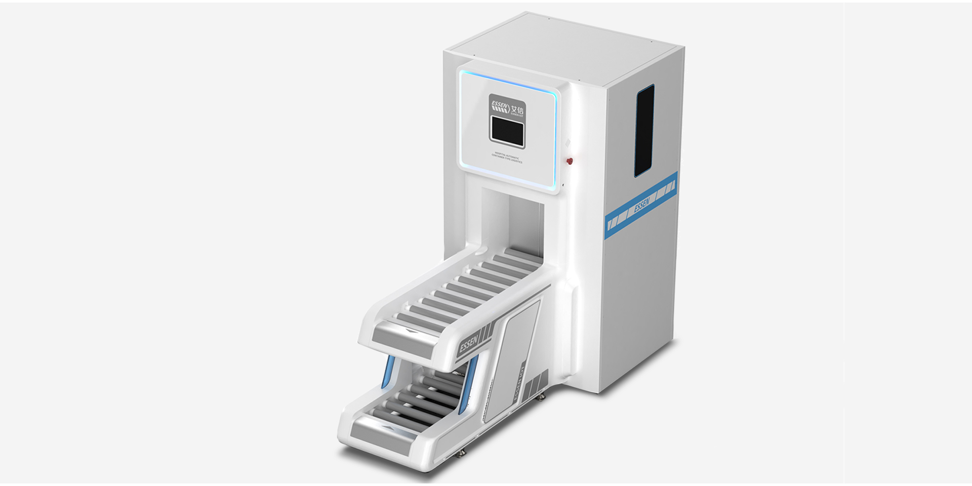 智能中型箱式物流傳輸系統(tǒng)在外觀上將面板和傳送帶連接到一起,形成統(tǒng)一整體性,圓角的運用給使用者親和的感覺,整體白色的運用使其與醫(yī)院環(huán)境相契合,給人以安全,信任感。通過搭建院內(nèi)自動傳輸線,以周轉(zhuǎn)箱為載體,實現(xiàn)全院物資的自動化傳輸,既能解決靜配中心、后勤物資等大批量高效率的傳輸,又能夠滿足急診檢驗、藥品等快速傳輸?shù)男枨蟆O到y(tǒng)傳輸范圍涵蓋醫(yī)院大部分物品,徹底改變了傳統(tǒng)的推車加人力的運輸方式,同時彌補了其他院內(nèi)小型物流傳輸能力不足的問題,開創(chuàng)了院內(nèi)物流自動化的新模式,既節(jié)省運輸時間,又避免運輸中物資受第二次污染、丟失的風險。能夠快速快速對醫(yī)院物資進行傳輸,為患者和醫(yī)護人員節(jié)省更多時間,提高了就醫(yī)效率。