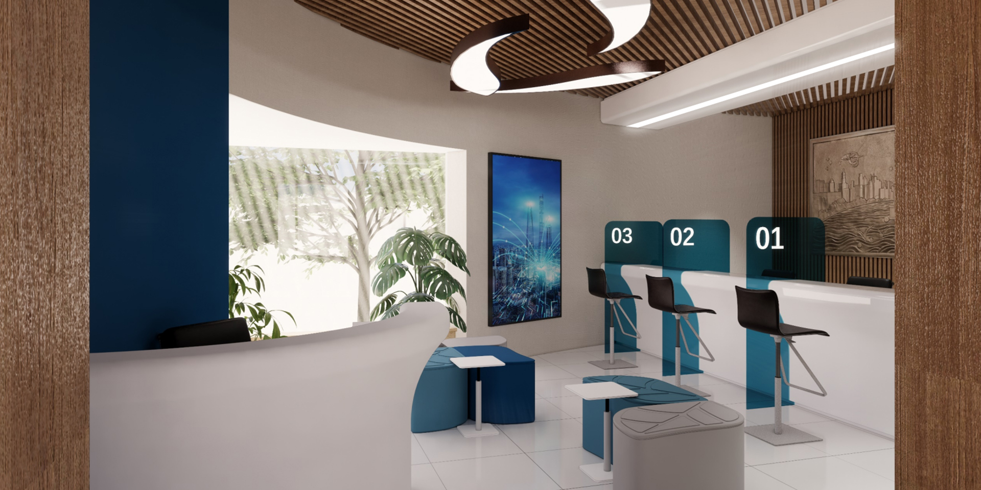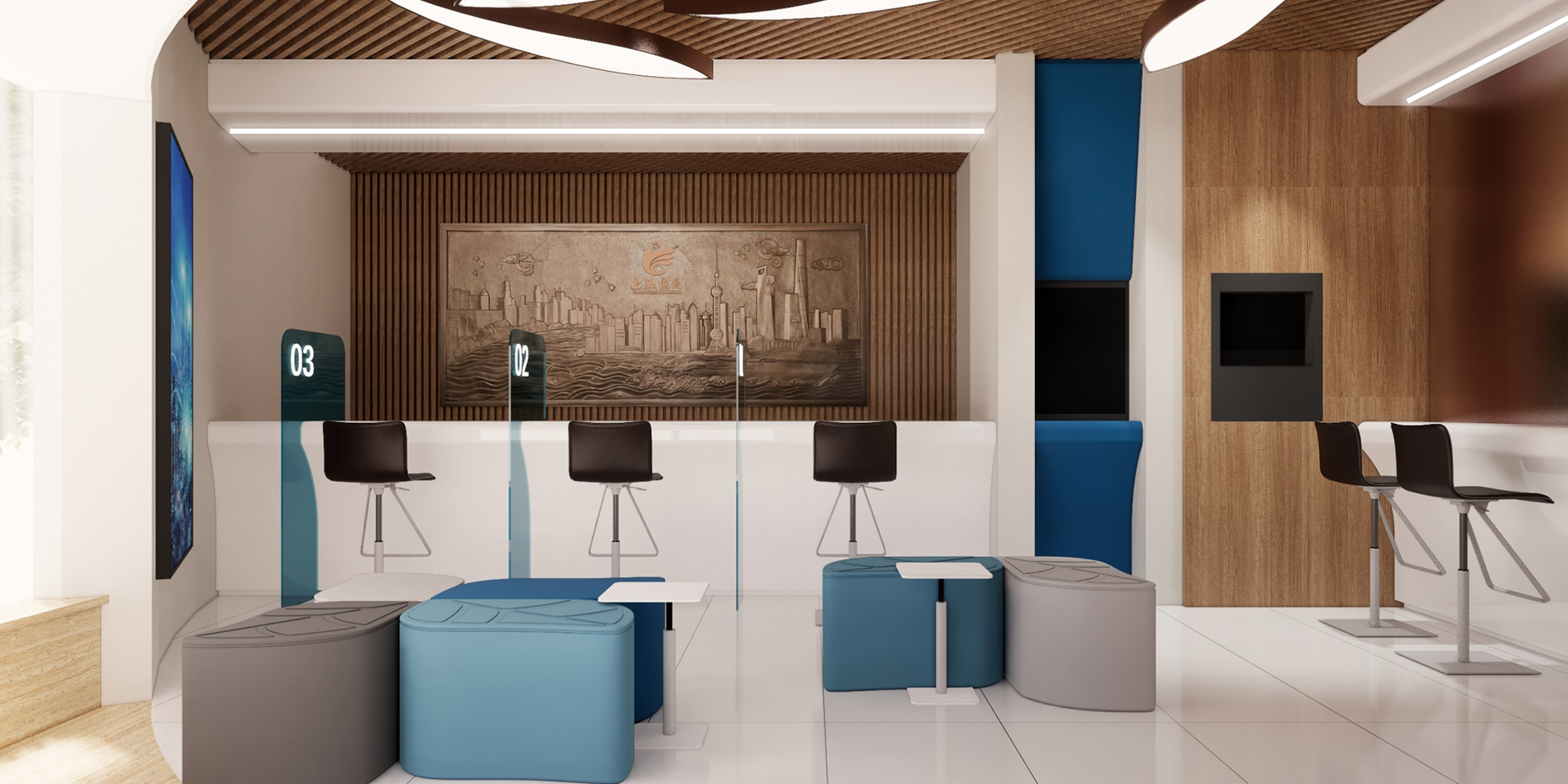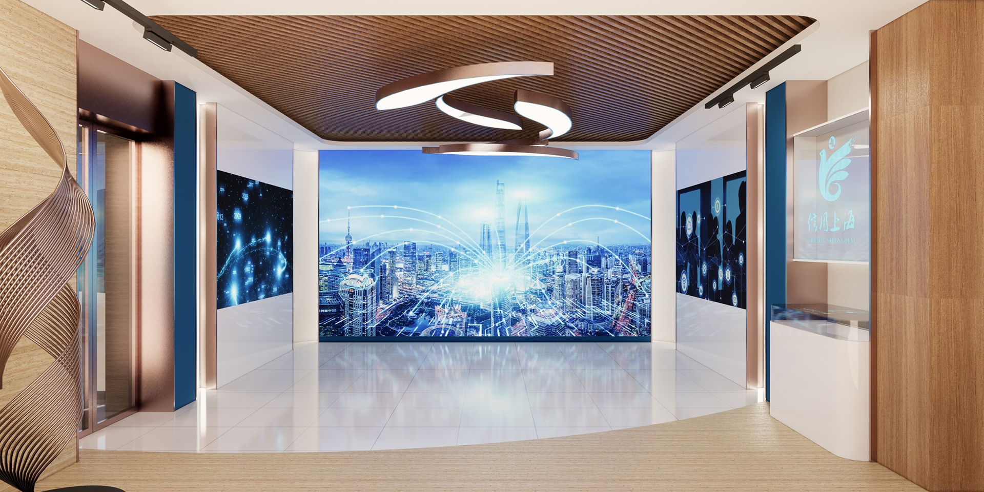 設(shè)計理念:四度空間理論。流動空間:在此項目設(shè)計中,避免孤立靜止的體量組合,而追求連續(xù)的運(yùn)動空間。有序的瀏覽路線、空間有聚合主次、圓融設(shè)計增強(qiáng)流動感。融合空間:從空間上打破各個功能領(lǐng)域之間的屏障,用串聯(lián)空間的形式促進(jìn)相互融合。服務(wù)大廳、會議空間、展示空間、洽談空間、圖書角空間、黨建空間。第三空間:人的活動與環(huán)境之間存在一種相互滲透相互改變的過程。環(huán)境對人產(chǎn)生啟發(fā),反過來人的活動也會促進(jìn)環(huán)境的改善。文化空間:將信用文化滲透至空間設(shè)計,將空間環(huán)境進(jìn)行文化的深入詮釋。提煉信用文化,以不同展現(xiàn)方式呈現(xiàn)及滲透信用文化。